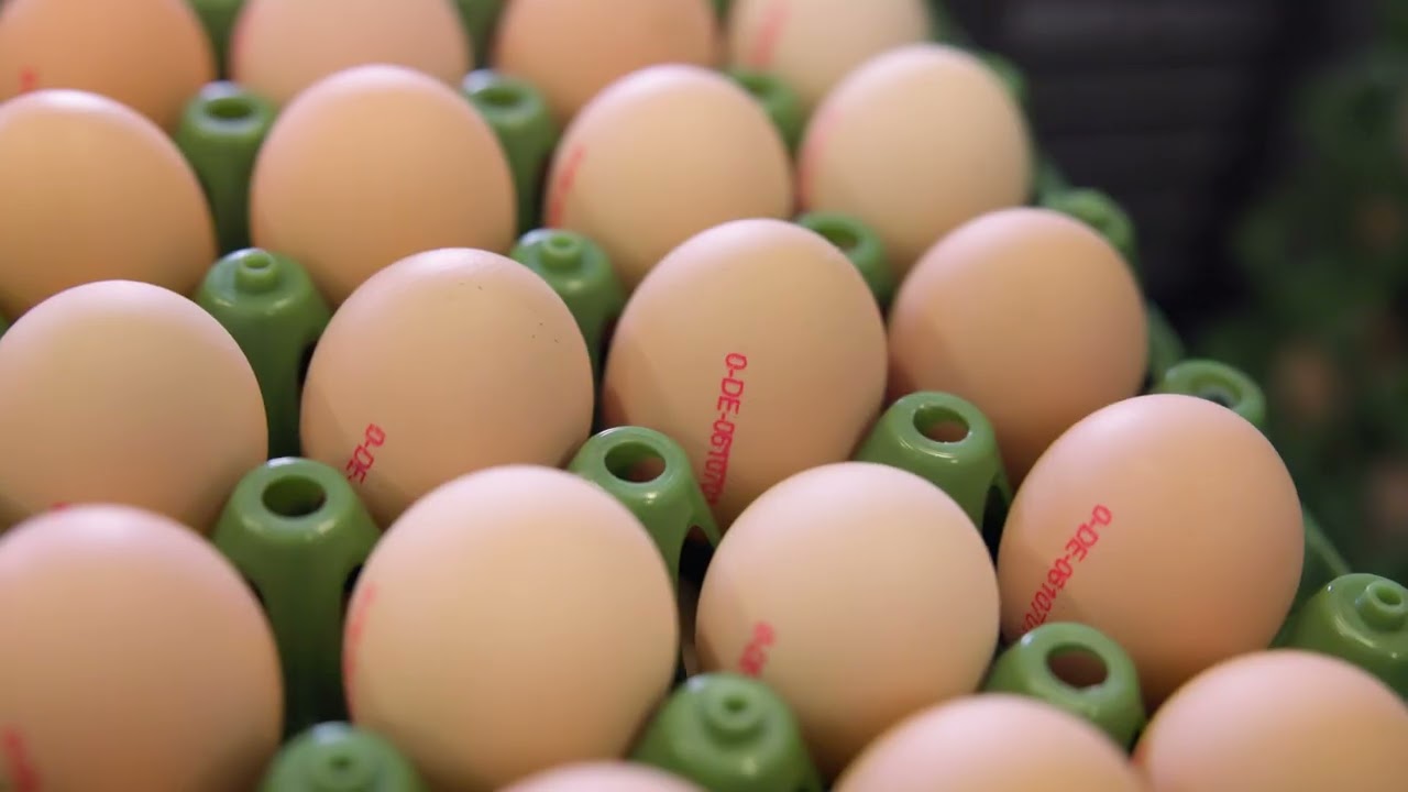 Die Eier werden direkt auf dem Hof der Möllers mit einem Code markiert. Dann werden sie sicher verpackt. Schau dir an, wie das funktioniert.