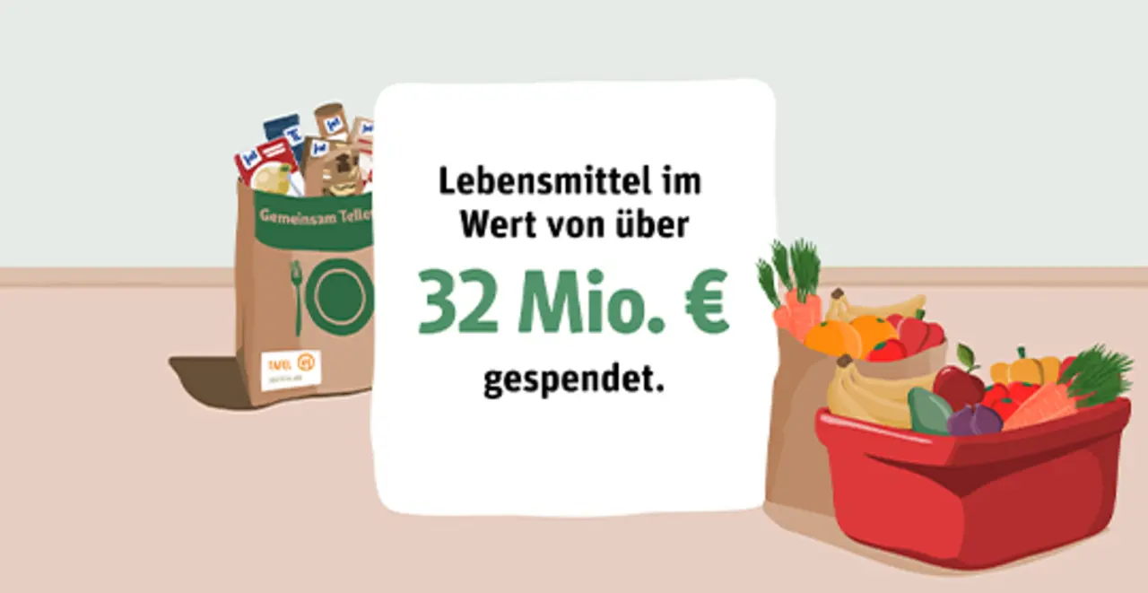 Unsere REWE Märkte spenden täglich frische Lebensmittel, die zwar nicht mehr verkauft, aber noch bedenkenlos verzehrt werden können. Die Tafeln geben diese an armutsbetroffene Menschen weiter, die sich eine ausgewogene Ernährung oft nicht leisten können. Mit deiner Spende kannst du ab dem 23.02.2026 diesen Beitrag noch weiter erhöhen und gemeinsam mit uns Teller füllen.